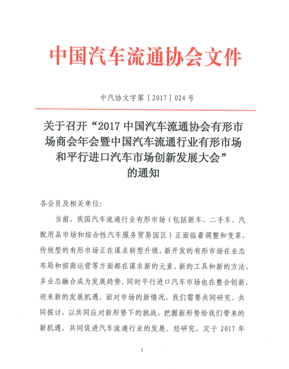 关于召开“2017中国汽车流通协会有形市场商会年会暨中国汽车流通行业有形市场和平行进口汽车市场创新发展大会”的通知