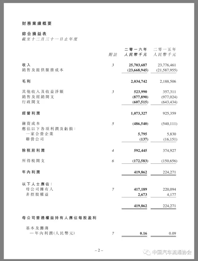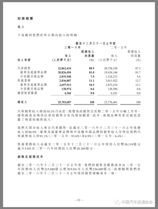 2016年度宝信汽车实现总收入257.0亿元人民币(货币单位下同),同比上年增长8.1%;其中汽车销售收入228.6亿元,售后服务收入28.4亿元;集团毛利为20.3亿元,毛利率7.9%;年内实现净利润4.2亿元,同比增长87.2%。