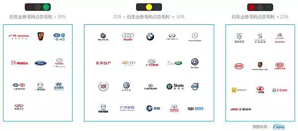 从品牌来看,各品牌间衍生业务的盈利能力不尽相同。凯达研究院根据衍生业务的毛利占比将主流品牌标记为“红绿灯”的形式,直观体现衍生业务的盈利能力和盈利空间:
