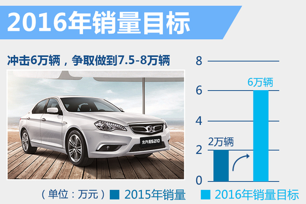 数据显示,2015年北汽新能源销量达2万辆,今年北汽新能源将投放五款新车,销量目标也有很大的提升,年内将冲击6万辆销量目标,争取做到7.5-8万辆的成绩单。从今年北汽新能源公布的销量目标来看,企业对年内投放的多款新车充满信心。