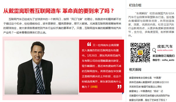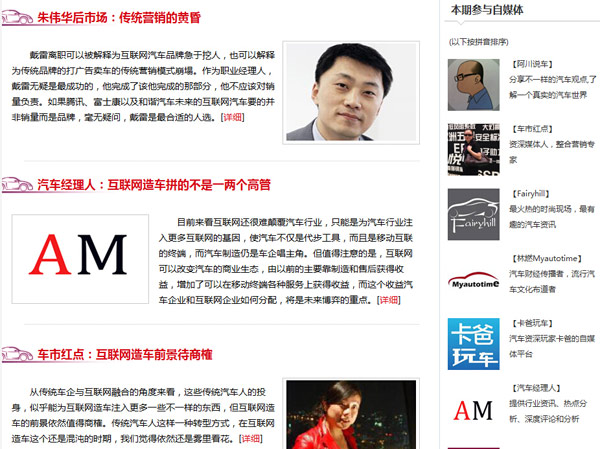 1月29日,搜狐汽车与SA汽车行业自媒体联盟联合推出的精品栏目“车闻解码”正式上线,首期栏目由搜狐汽车编辑部与朱伟华后市场、车市红点、AM汽车经理人、Fairyhill、阿川说车、小拉车、Myautotime以及卡爸玩车等8位知名自媒体人共同打造,针对时事热点进行多角度深度解读。“车闻解码”的推出,标志着搜狐汽车”专业编辑+PGC”内容生态平台的进一步完善和深化,也意味着SA汽车行业自媒体联盟向专业内容生产组织的转变和进化,上线后在业内引起了良好的反响。